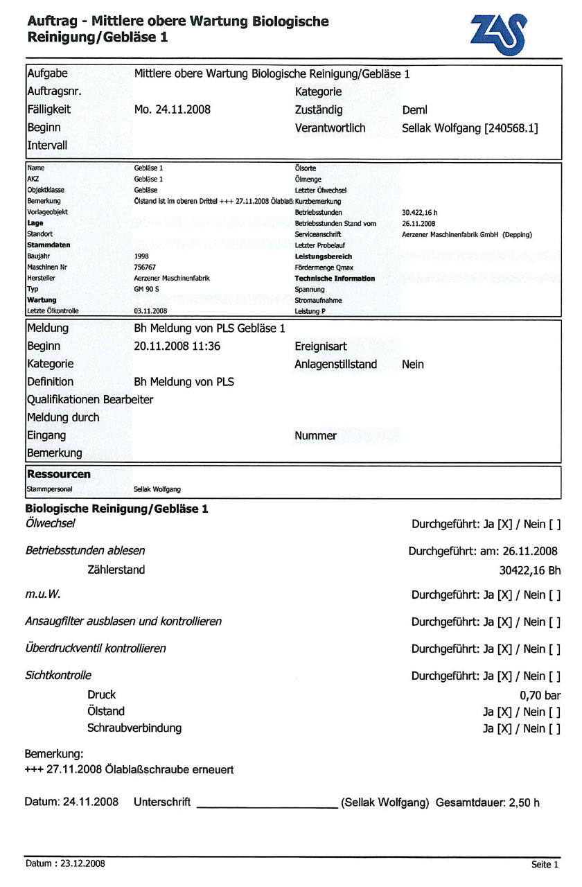 Auftragsbogen des Betriebsführungssystems „GS“, hier zur Gebläsewartung